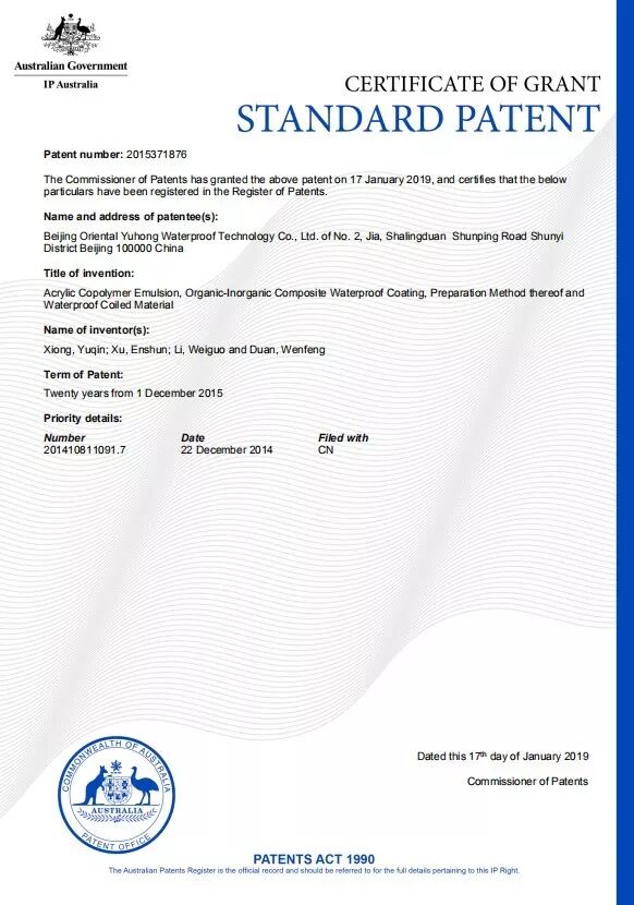 據(jù)悉,澳大利亞的標準專利申請門檻高,需要具備極強的新穎性、創(chuàng)造性和實用性,保護力度強,因此對專利產(chǎn)品的要求也極為嚴格;其保護期限與中國的發(fā)明專利類似,均為20年。東方雨虹從2015年12月1日起開始申請澳大利亞專利,該項專利技術實現(xiàn)了HDPE產(chǎn)品獨特的預鋪反粘效果。